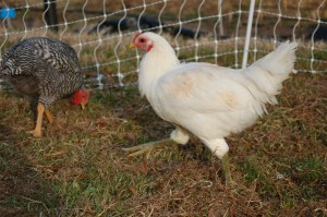 Now, a rooster, if doing his job properly, is an asset because he will actually protect the hens by herding them under cover when an overhead danger flies through (a hungry hawk – we have plenty of them). And a proper rooster will indeed make his ladies “roost” at dusk – thus his name. To roost means to perch up off the ground for the night’s sleep, thus being positioned for safety from foxes and other hungry nighttime predators.