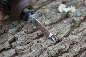 We purchased Shiitake and Oyster plugs. These are the plugs. They are simply little wooden dowel pieces that have themselves been inoculated with the desired shroom. To get the plugs in the logs, a hole has to be drilled for each one.