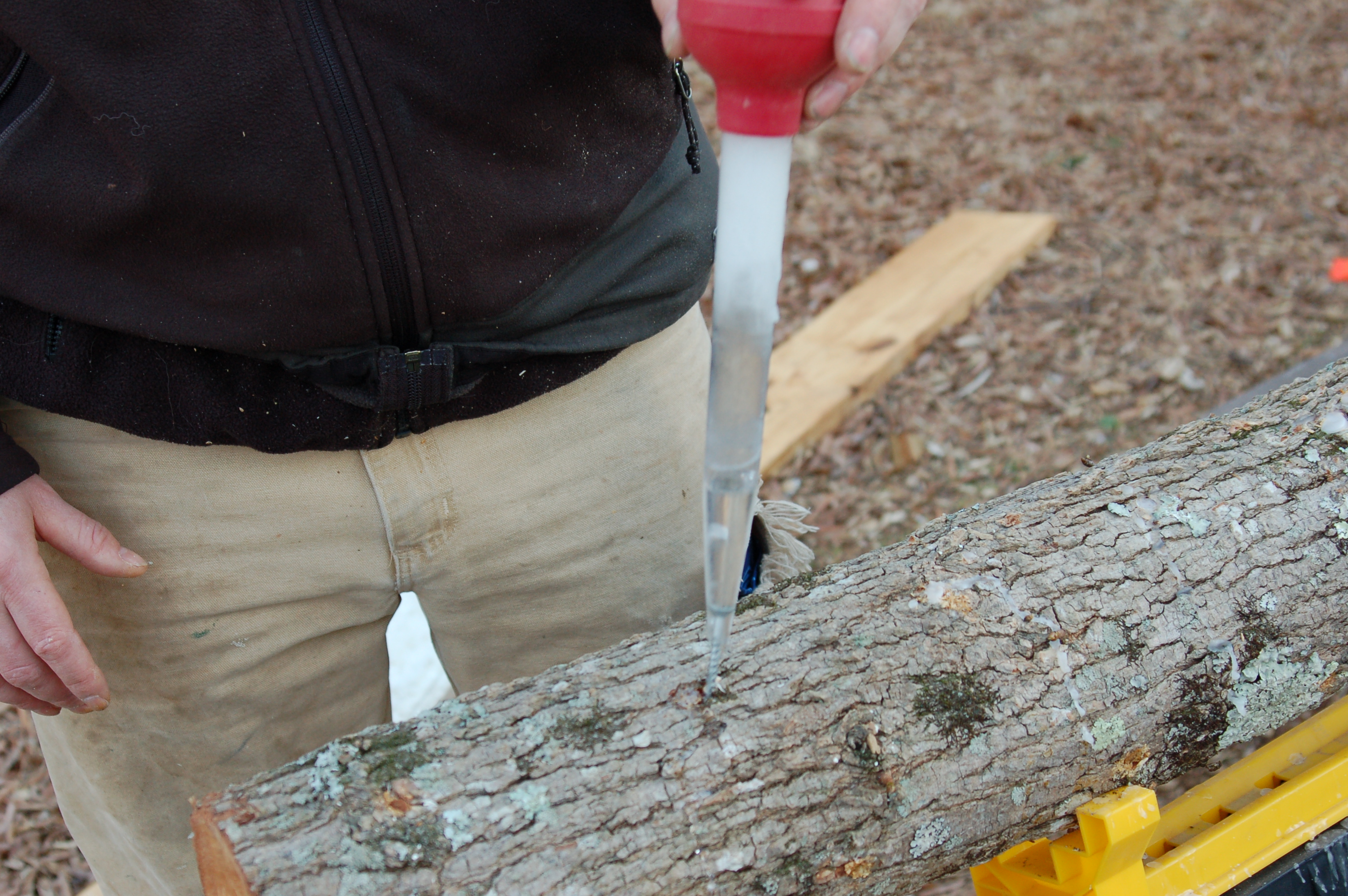 The plug is then tapped in and sealed with wax (to help keep out other fungi while ours gets established).