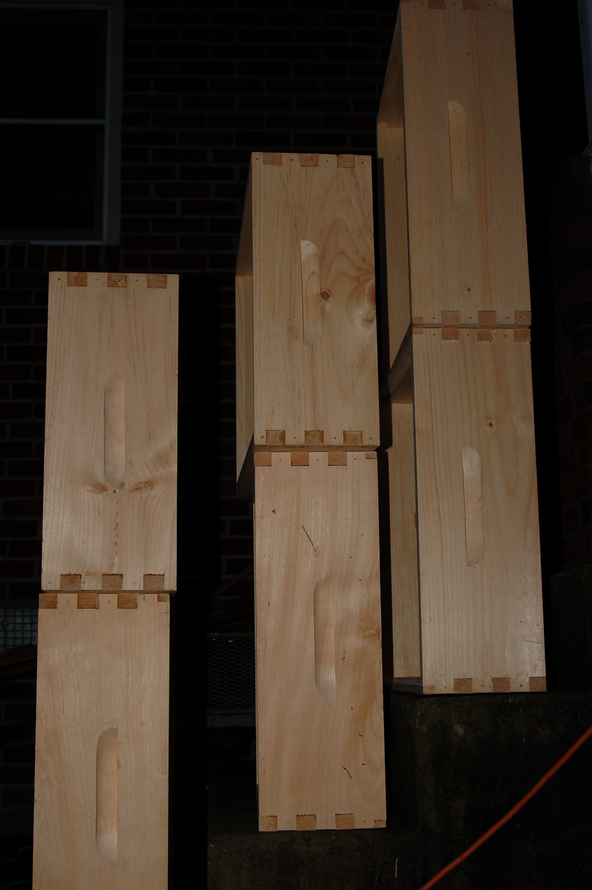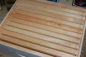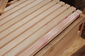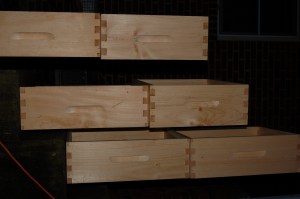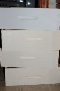 We ordered two hives (that consists of three hive boxes each, with ten frames per box) and two packages of bees (they arrive April 7th). The bees build comb on the frames and fill the cells with pollen, nectar, and eggs. I’m sure I’ll blog tirelessly about that process in the future as I get to watch it play out, so for now I will just share the assembly and preparation process. Here are some individual boxes: