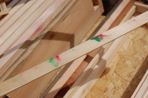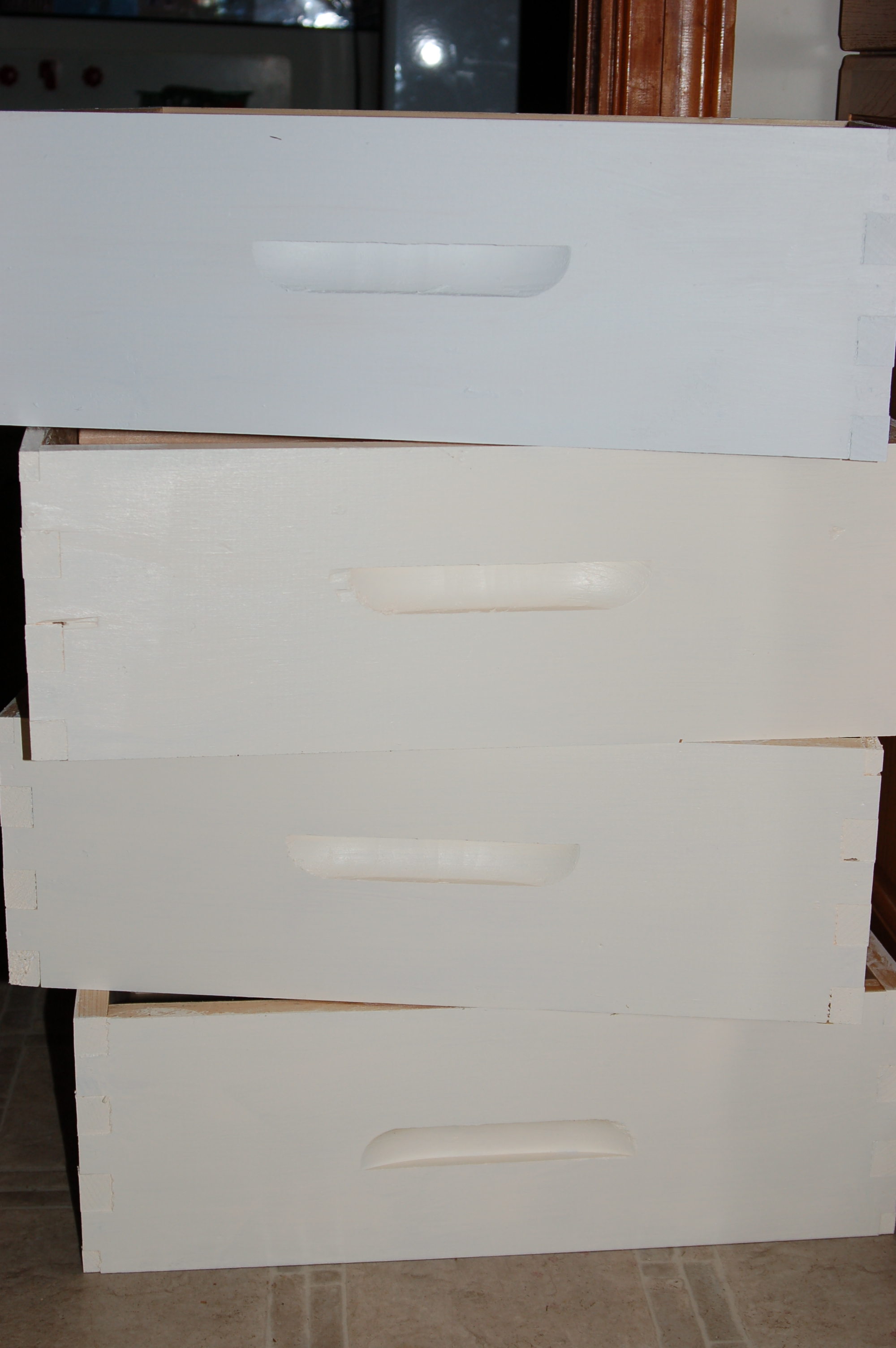 They get painted a light color so that in the summer they don’t become solar ovens. That would kill the bees. These white ones, below, are stacked caddy-corner because the paint was drying. (Since other farm activities are limited on a rainy day, we chose to use a rainy day to paint them on the back porch and brought them inside to dry.) The plain white drives me a bit nuts, so I plan to exercise my very limited artistic ability to fancy them up a bit. Stars might be as intricate as I get.