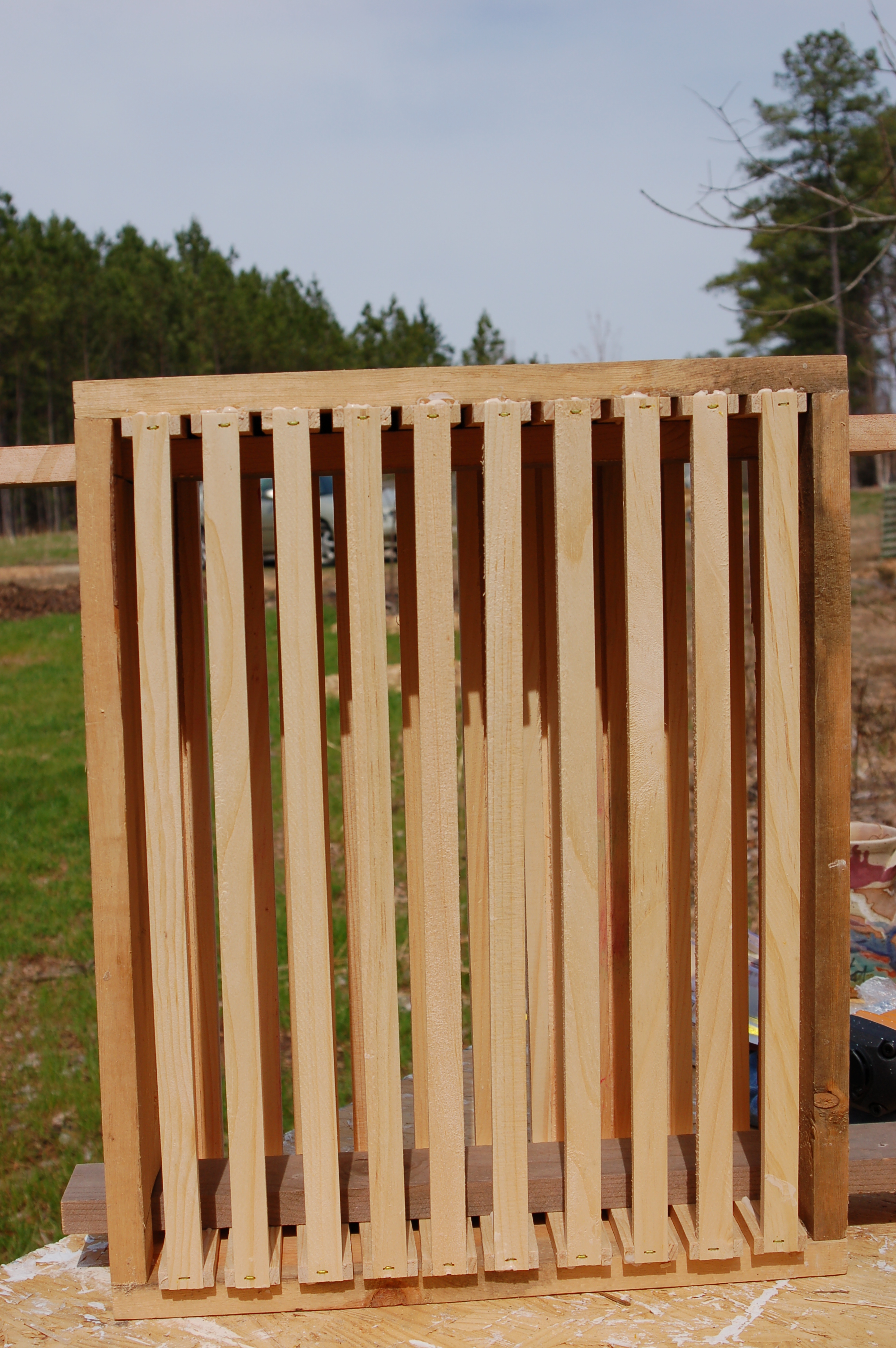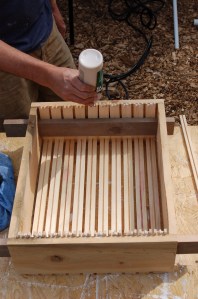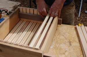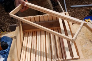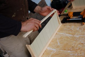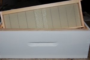 Each frame has a wax and wire foundation in it to give the bees a head start for the season. I’ve had the book Honeybee Democracy recommended, however, and I’ve heard that it gives reason to think about not forcing these foundation guides on one’s bees. So in the future I think I’ll play around with giving them empty frames to build upon.