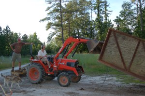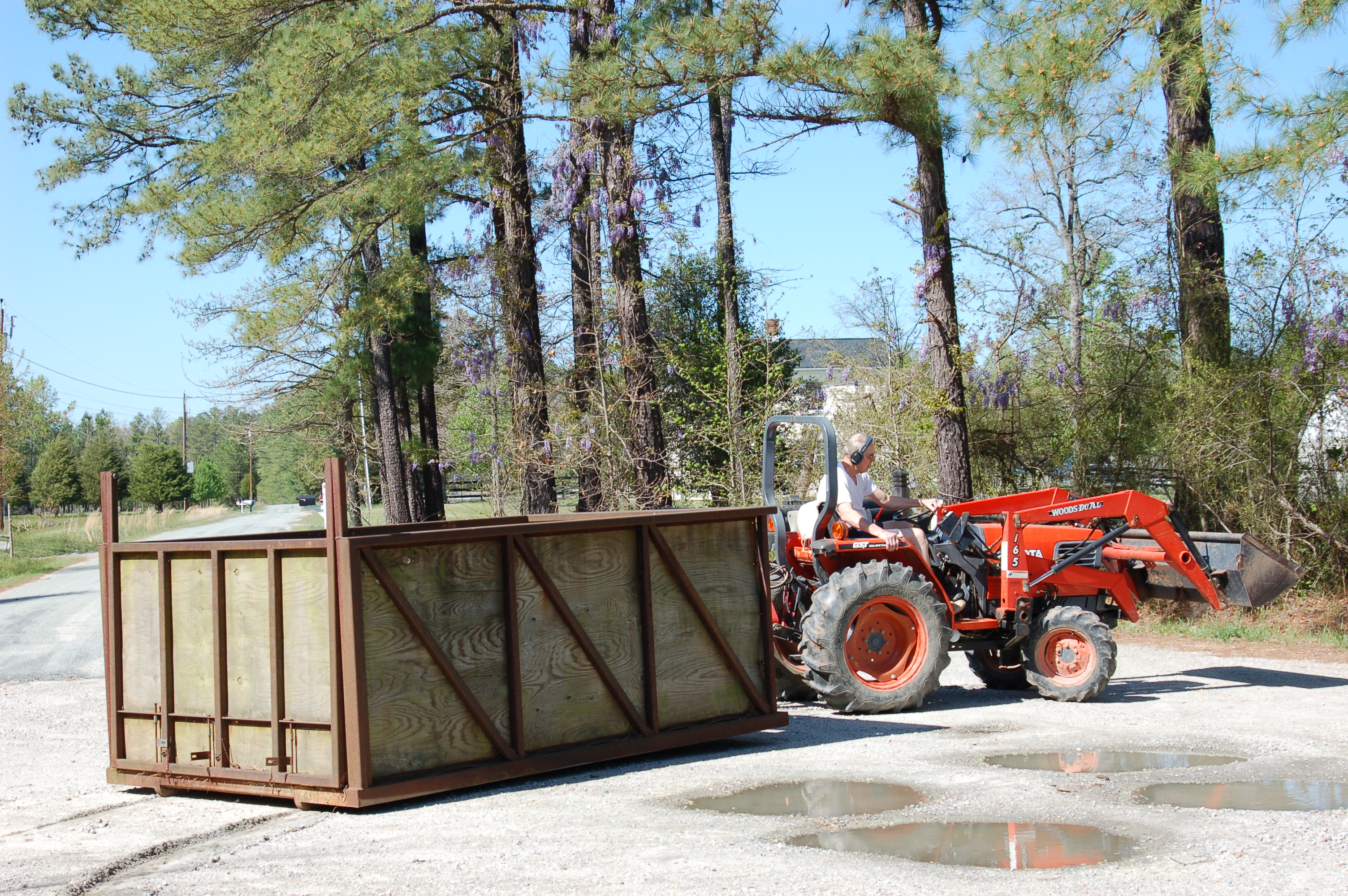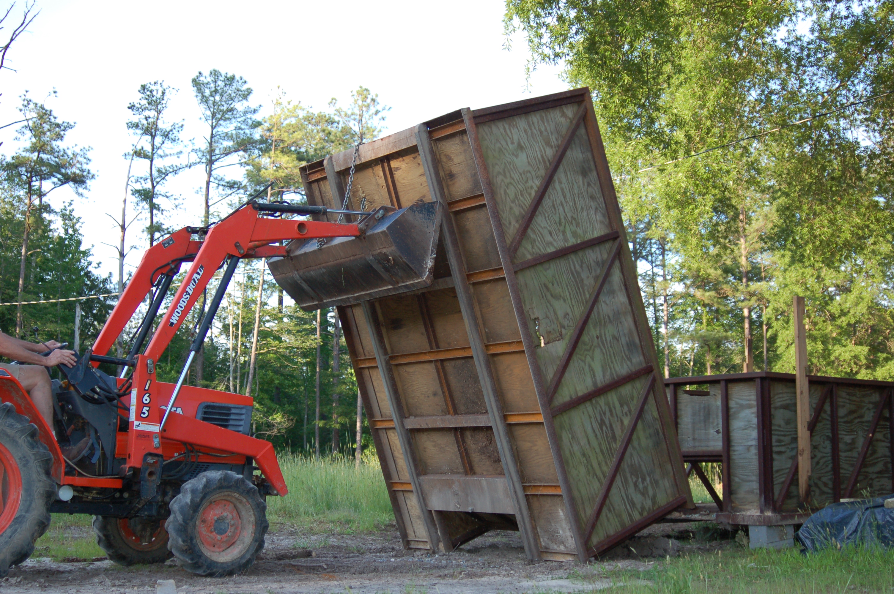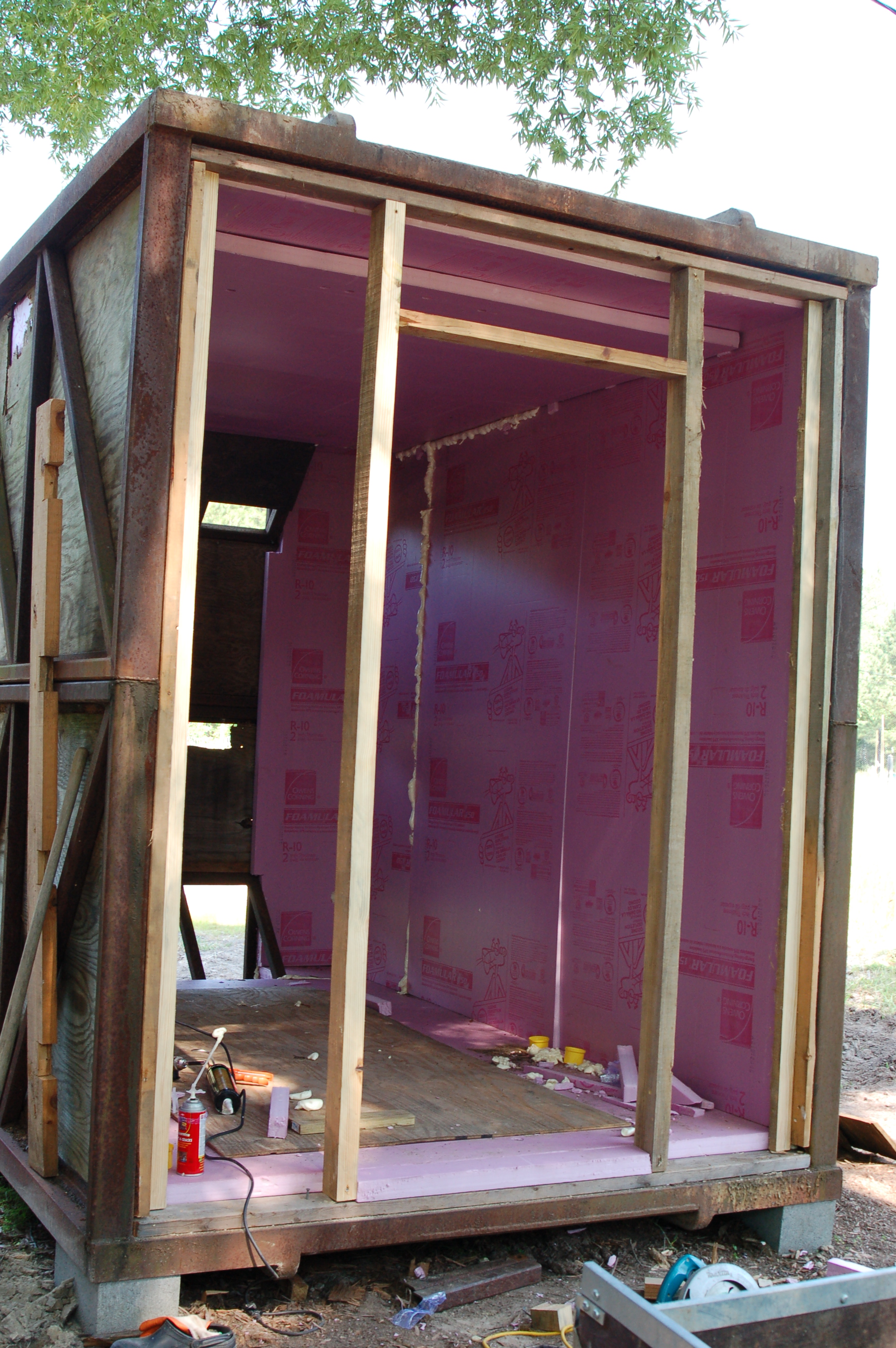 Any respectable vegetable farm needs cooler space – lots of refrigerator cases or a walk-in cooler. We don’t have the place to put refrigerator cases right now (a barn is on the wish list for this next year) and so we decided to build a walk-in cooler, made possible by this nifty device called a Cool-bot. We needed something we could insulate and then air condition with the Cool-bot set up. Neither of us have a benevolent aunt nor a trust fund, so building something from scratch was not an option. We looked around the place for what we might be able to use as a shed-like space. What did we find? Two steel-framed structures that my father built 20 years ago to use as dumpsters for his construction business. (Doesn’t everyone’s father build steel-framed dumpsters when they need one?!?) Rest assured, these structures haven’t seen trash for at least 15 years, and have just been resting peacefully in what I like to call the “resource” area. Here’s one on its way to its new spot as a cooler: