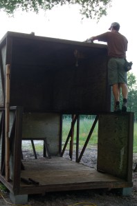 Our plan was this: we have two of these structures. Invert one over the other and we’ll have an enclosed space. Sweep out, add insulation, install cooling unit, and voila: walk in cooler. Between that vision and the final product, however, was the daunting task of actually flipping one of these very heavy things on top of the other. It is very fortunate that we don’t have any actual employees and therefore weren’t subject to OSHA during this process. I held onto the children and the dog and took pictures from a safe distance. Here is what ensued: