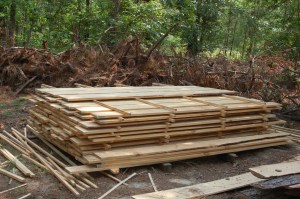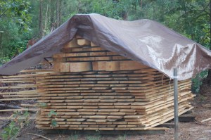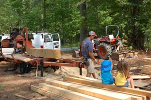 I don’t have a photo with the door on – that will have to come later. But the cooler has been up and running for a few weeks now. We still have to add the second layer of insulation, and then we’ll put on some siding we had milled from trees that we took down. Here’s the milling: