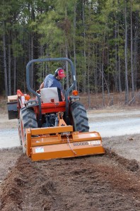 We grow cover crops to accomplish various purposes, depending on the needs of the specific growing area (fix nitrogen, break up clay, etc.) If a field hasn’t been cultivated before, we then till it using a reverse-tine tiller (this minimizes disruption to the soil structure as compared with a ‘traditional’ tiller). We grow in raised beds, which are shaped after tilling by an attachment to our tractor that Dan put together.