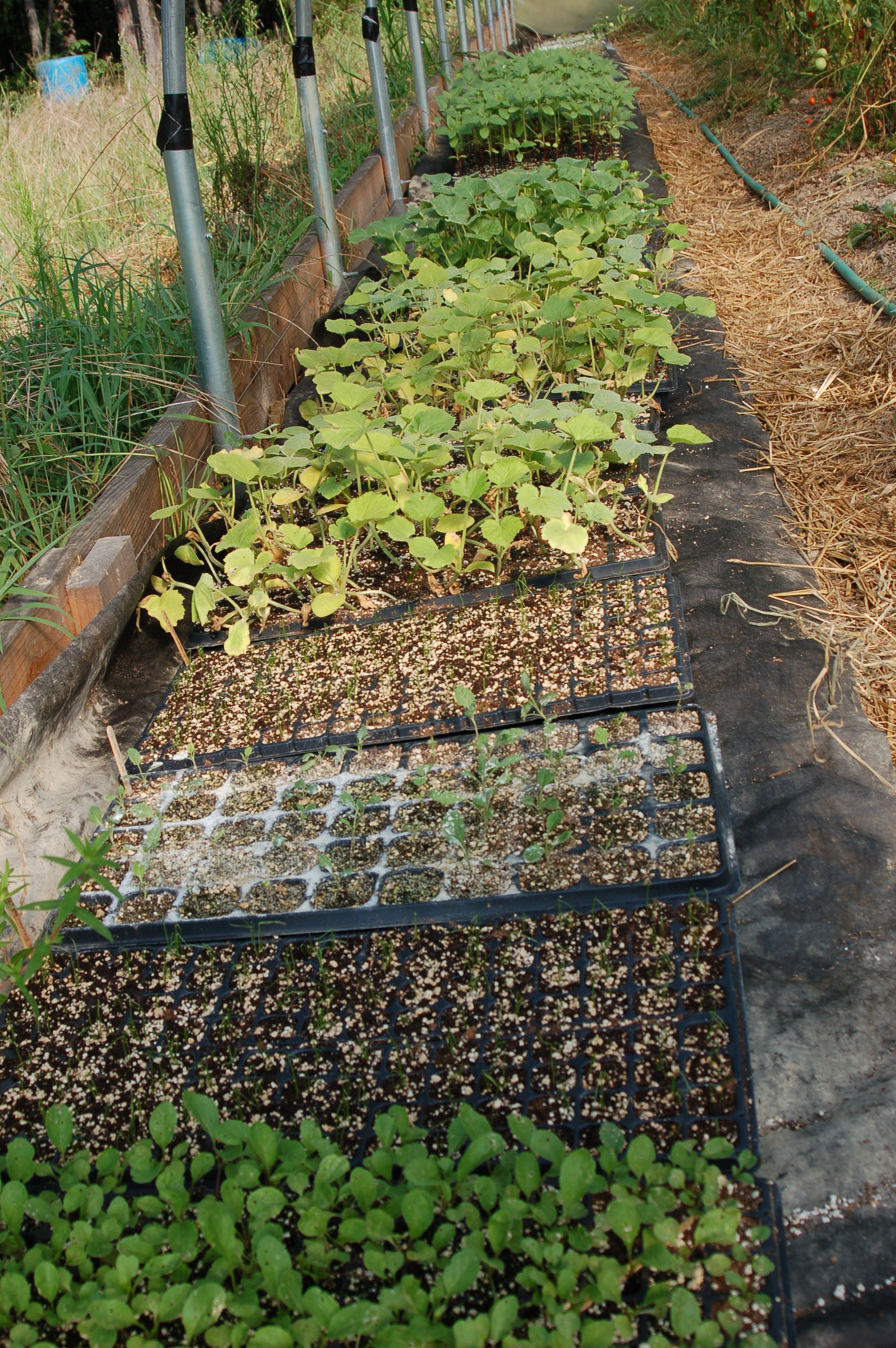 After beds are prepped, plants go in. We start in trays. Here are some of the plants for the fall. They’ll be going in the ground soon – anyone want to help?? 🙂