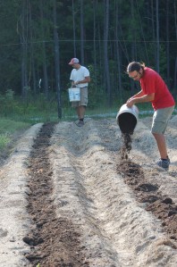 In the photo above, Dan is spreading organic fertilizer by the cupful (rather than bucket-ful). We purchase a chicken-manure based, organic fertilizer made by Harmony to supplement our compost. A little goes a long way.