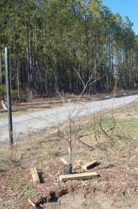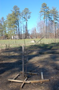 The wood is tied onto branches in order to weight them down, creating the desired shape tree. Shape is dictated by desired air flow, ability to bear the weight of the future fruit without breaking, and probably other things that I didn’t catch.