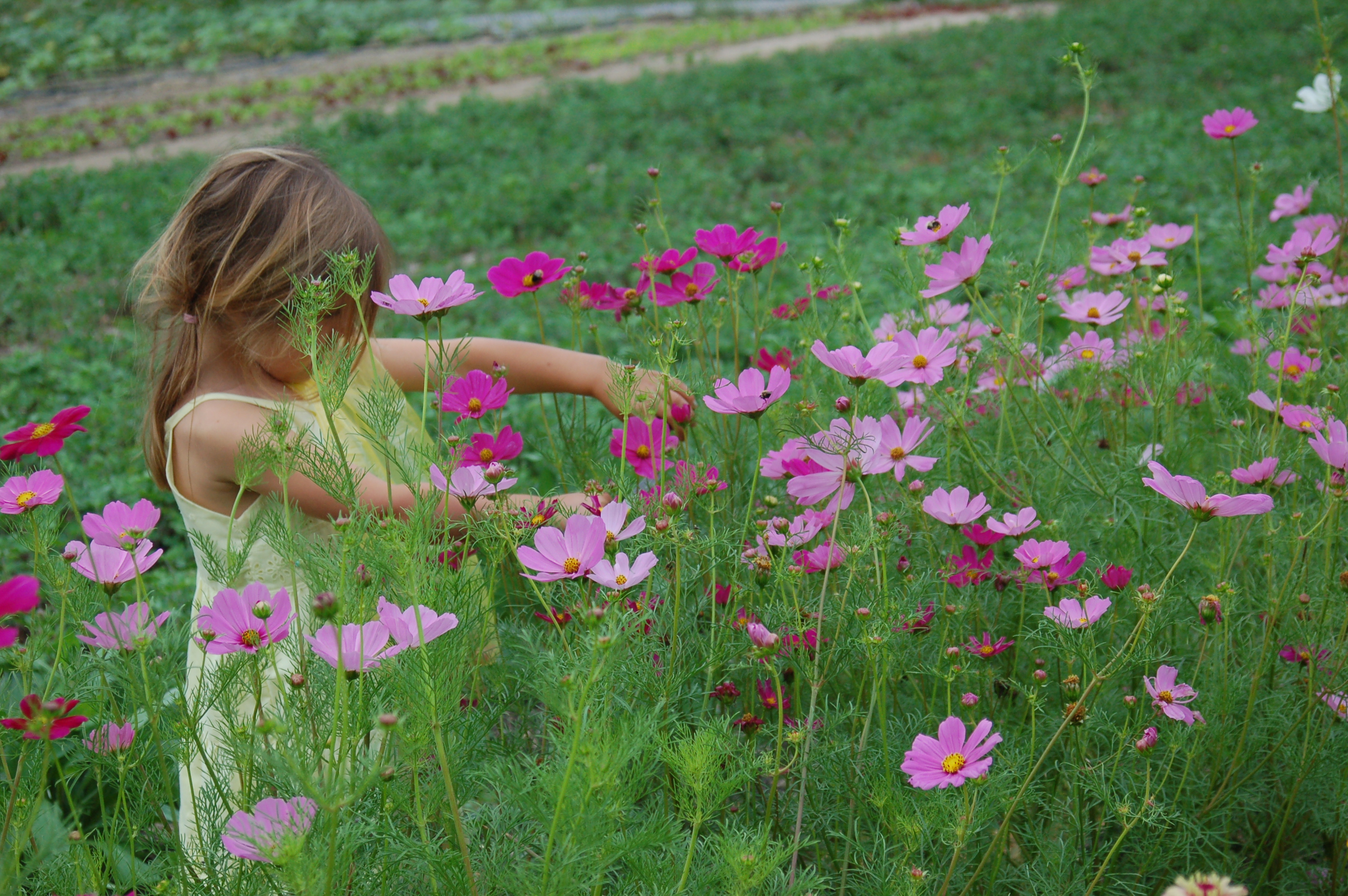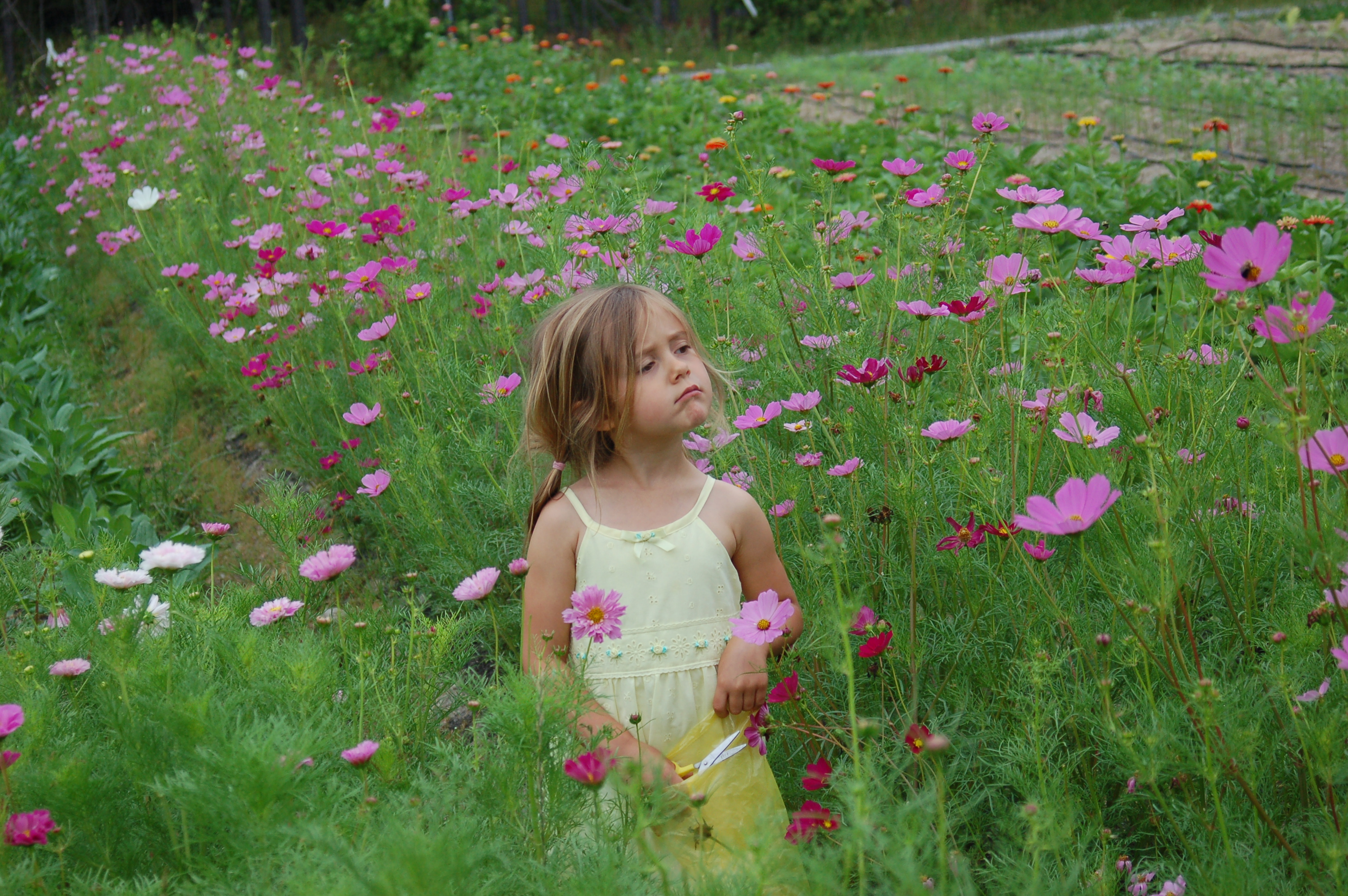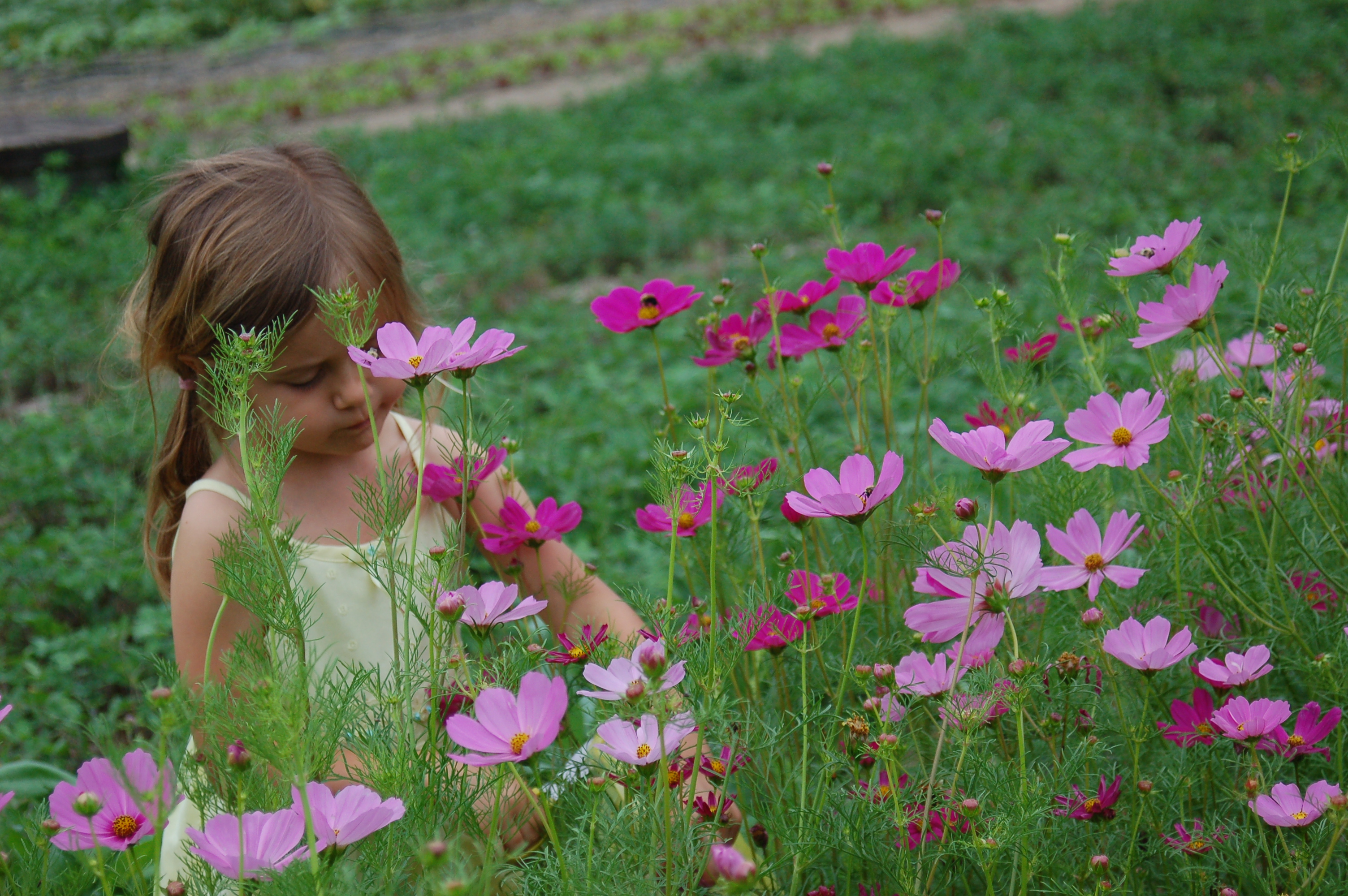 Chickens eating. Future salad growing. Adorable pre-schoolers cutting flowers.