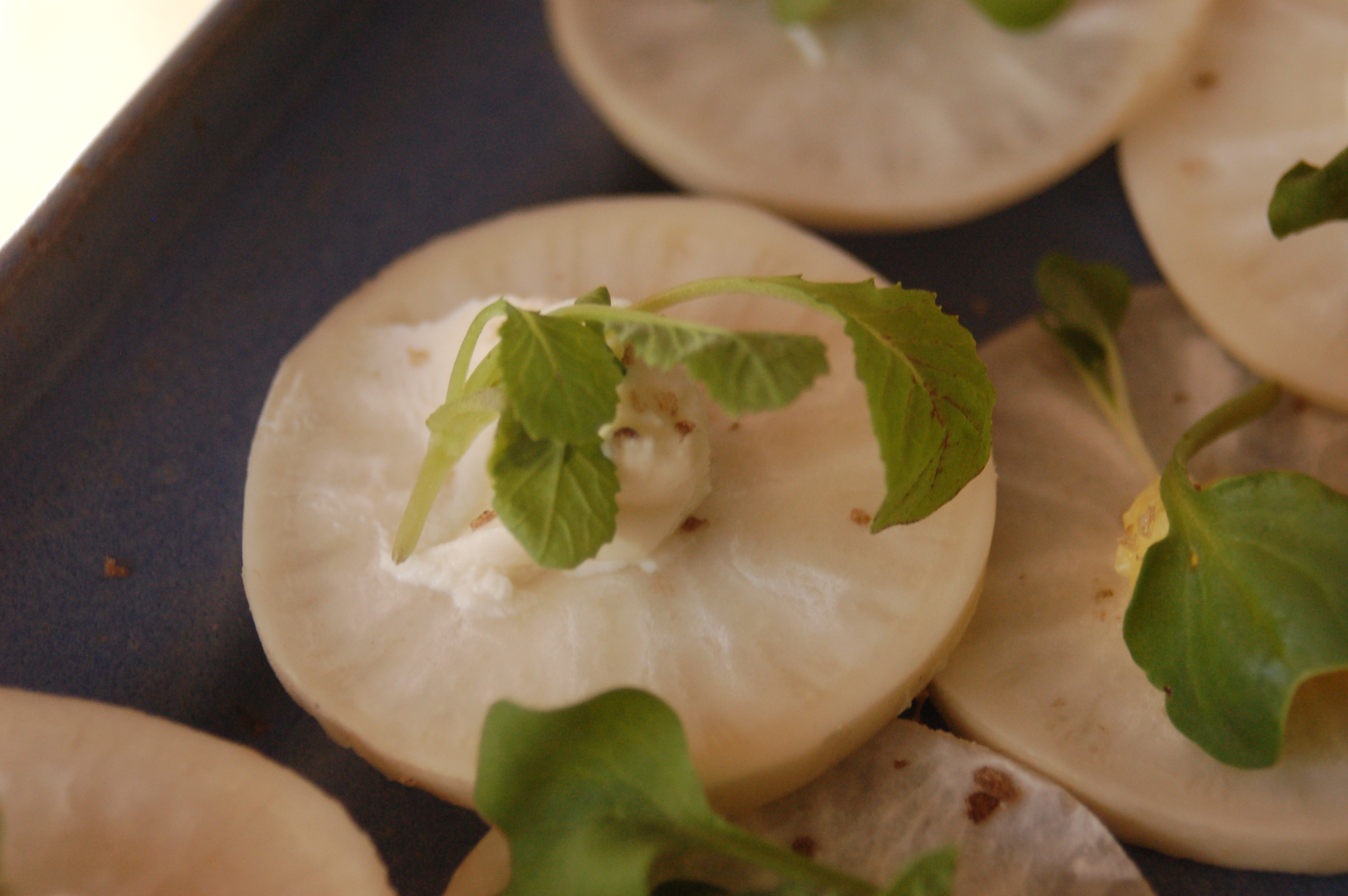 And….at the Brandermill market tomorrow, we will be sampling a little turnip snack that we love around here: Thinly sliced Hakurei turnips, topped with either sweet cream butter or Night Sky Farm’s goat chevre, and a sprinkling of smoked or merlot sea salt and micro-greens. Delicious! We hope you’ll stop by and try some.