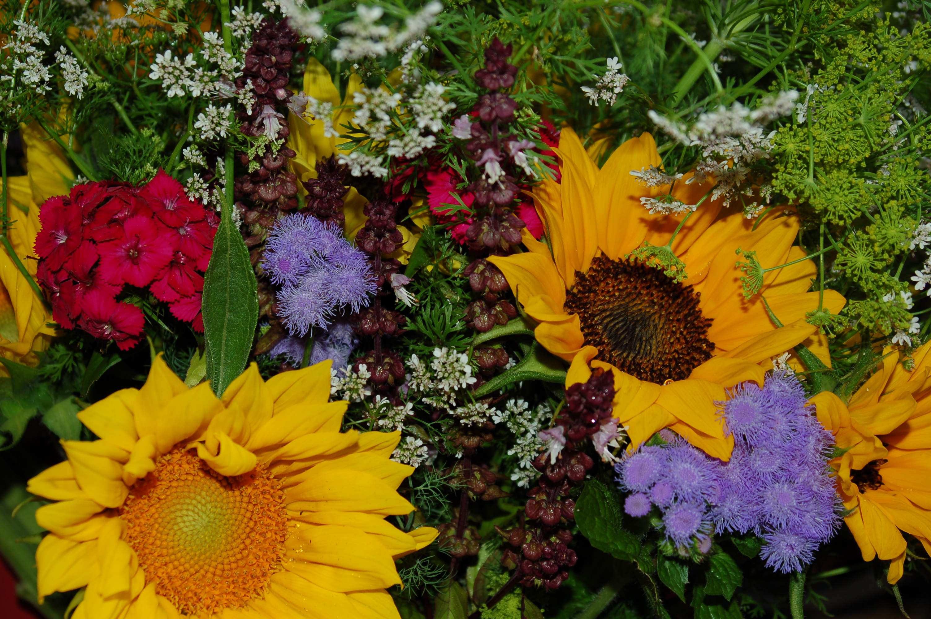 Sunflower Bouquets!, Beets, Bok Choi, Chard, Cabbage (small, traditional heads), Chinese Cabbage, Collard Greens, Dill, Garlic Scapes, Hearty Mix, Juicing Greens, Curly Kale, Toscano Kale, Red Russian Kale, Kohlrabi, Lettuce (green, red or speckled head), Mint, Peppers (Bell or Padrone), Radishes, Red Salad Turnips, Salad Mix, Scallions, Summer Squash…and Multigrain Bread.
