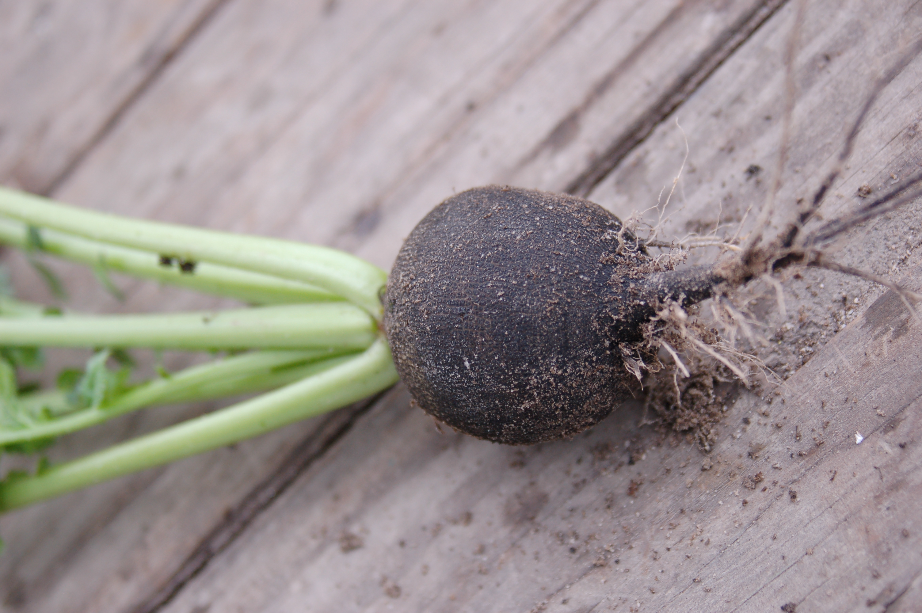 In addition to the abundance of salad greens, cooking greens, arugula, spinach, turnips, etc, we have some black radishes available this week. Check out this wild root: