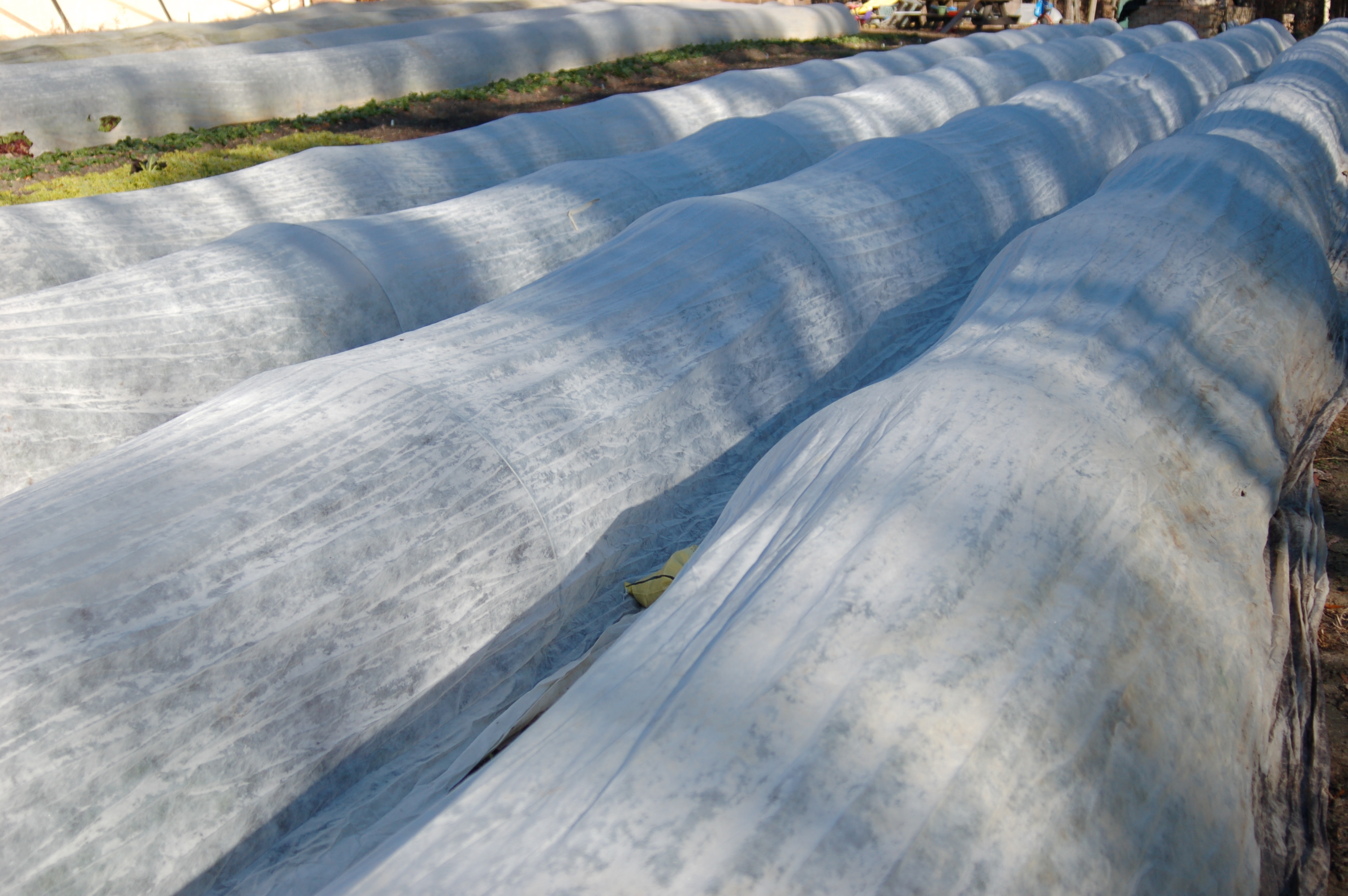 Lettuces outside were covered with row fabric, so it looks like a white snowscape around our house (sort of).