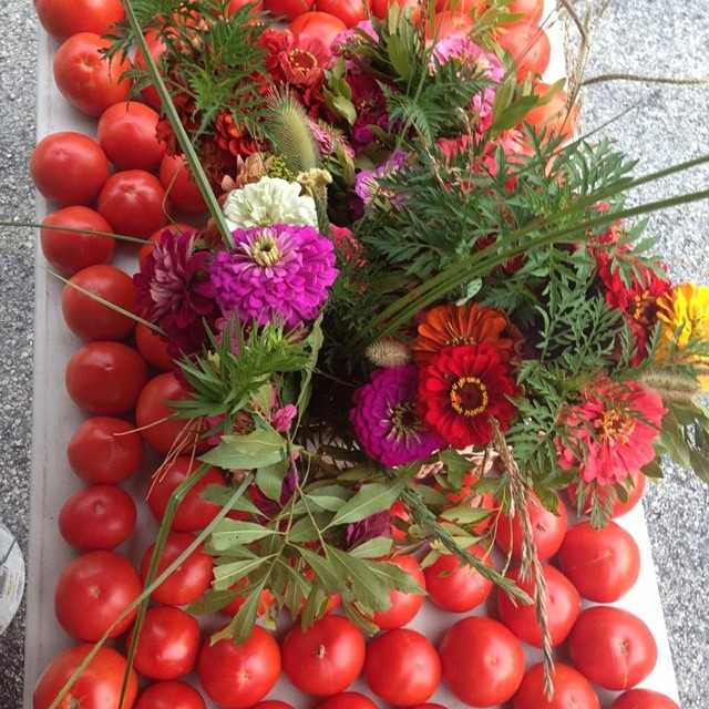 All pictures, like usual, are from this week. (The flowers certainly help brighten everyone’s mood!) The market booth above is from the South of the James market last week, featuring about a fourth of our harvest from last week.