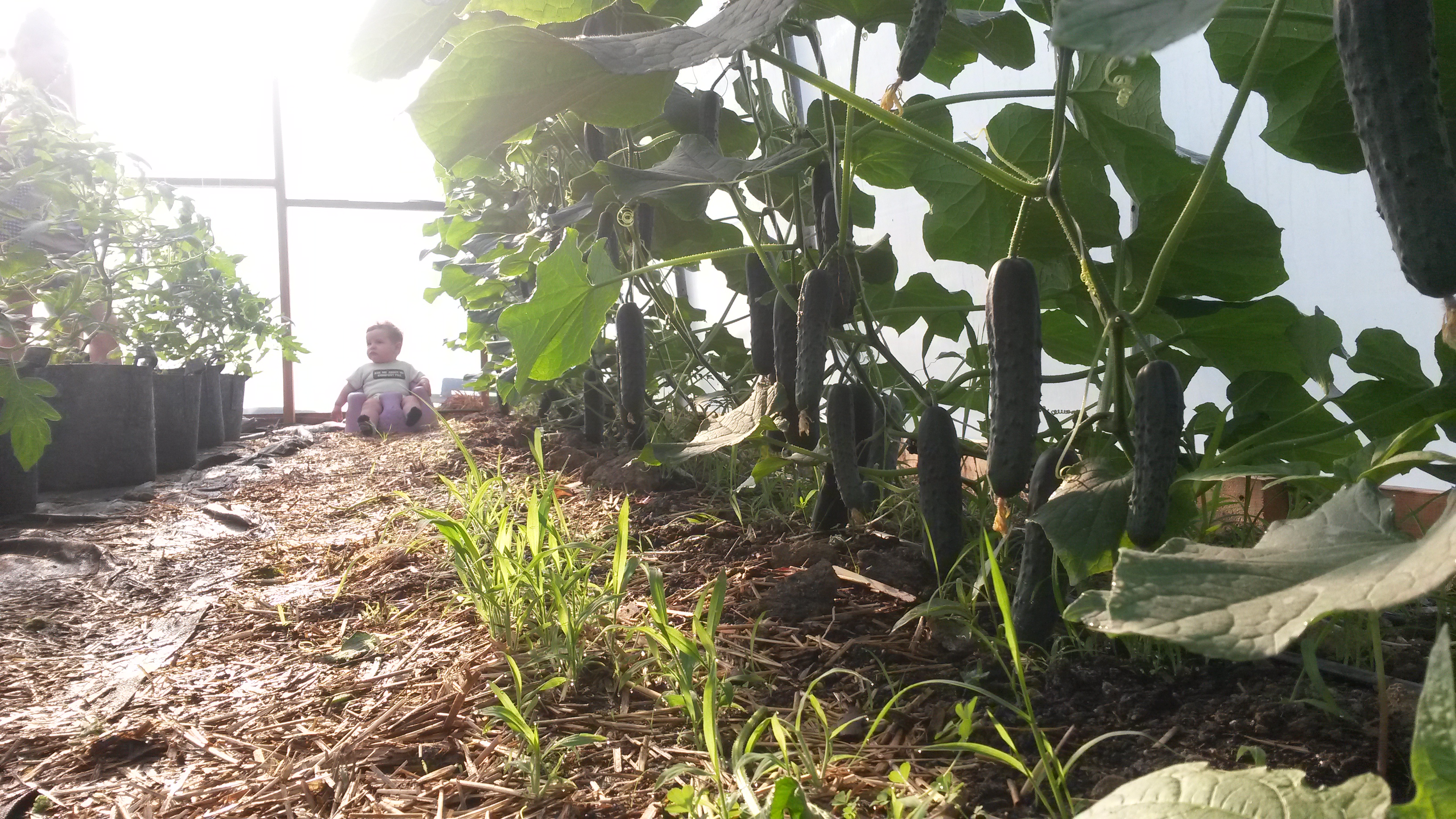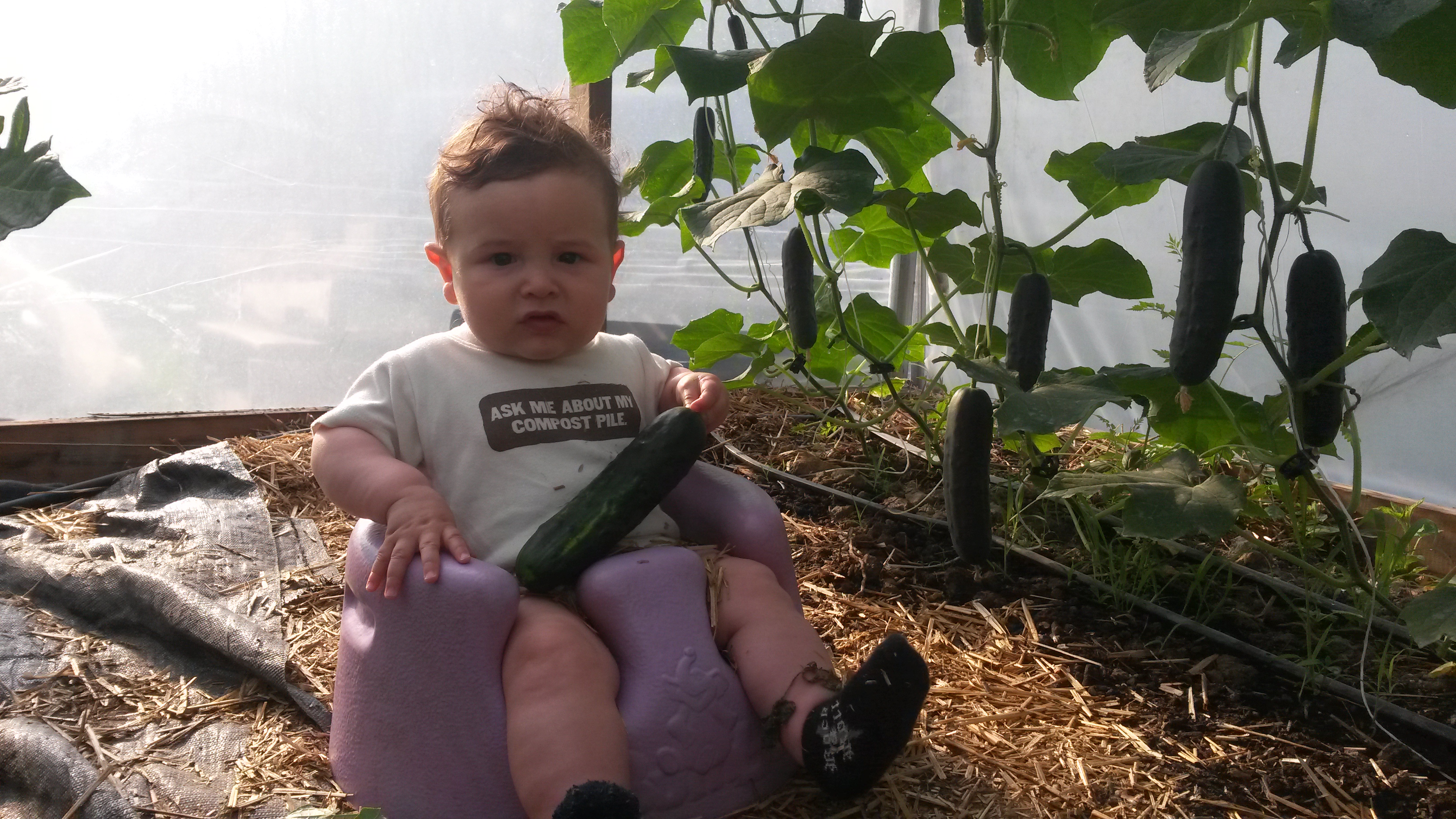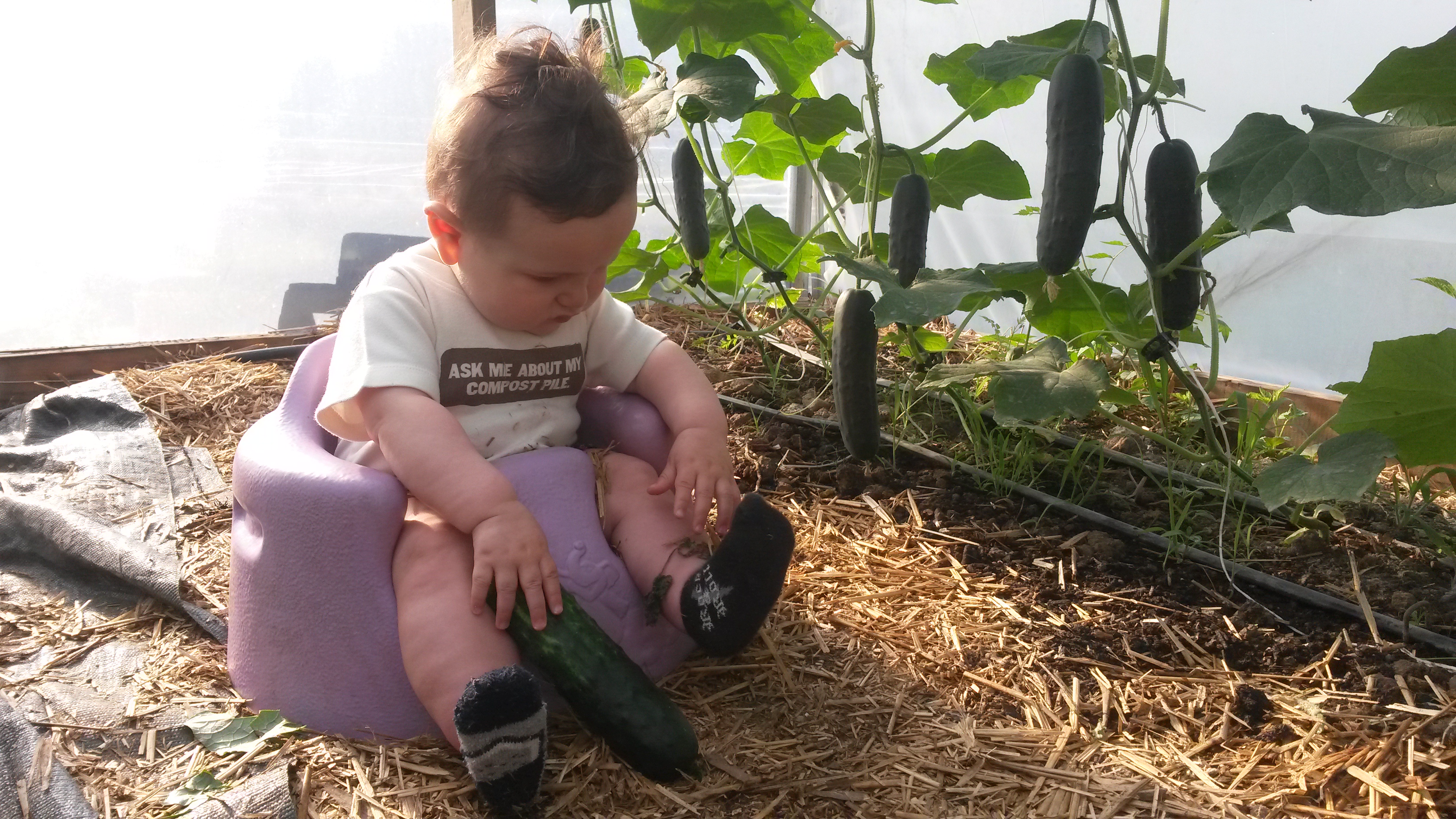 (Photo above by Tisha Lyn Photography, from a few weeks ago. See the cucumber plants behind Janet? Those little things are the fruiting plants in the above photo of our baby with the cucumbers, taken this morning!)