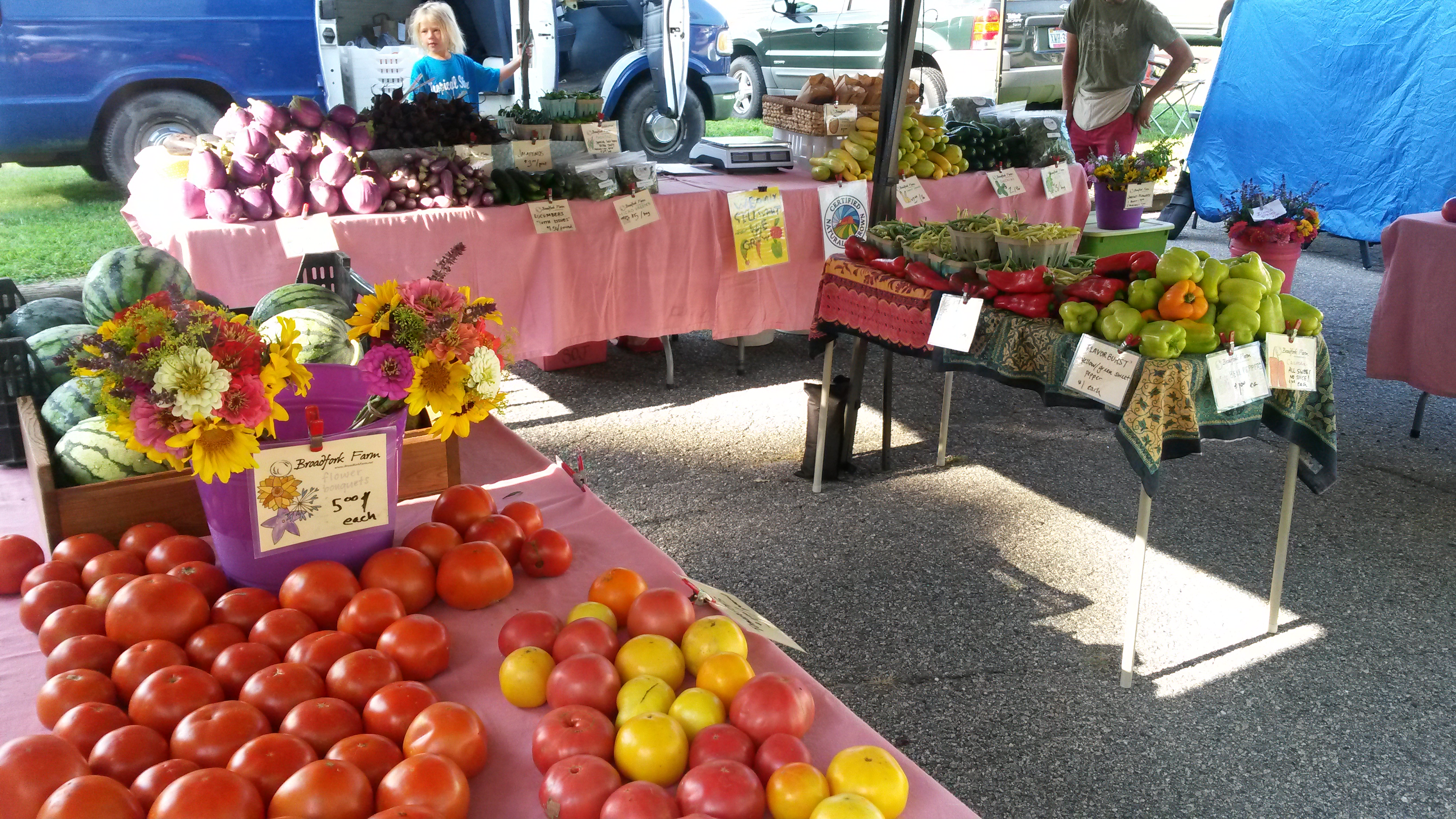 Pictured above is part of our booth at the Brandermill market last weekend. For those of you for whom that market is convenient, please do continue to tell your friends and neighbors about it. It’s a delightful market with all the staples: vegetables, fruit, meat, seafood, goat cheese, flowers, plants, pasta, bread, cookies…