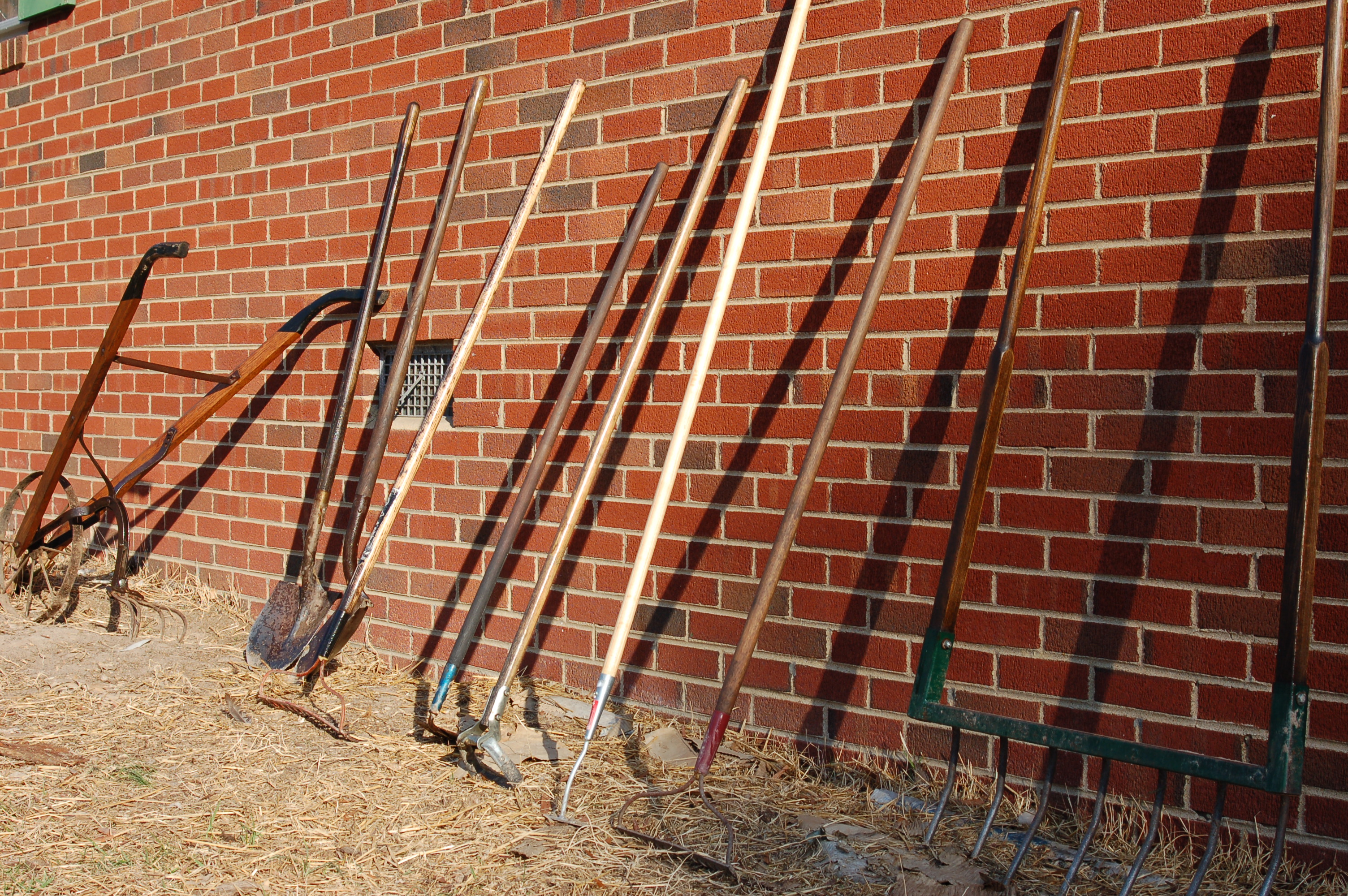 Recently oiled, the handles of our tools shine. The broadfork is far right.